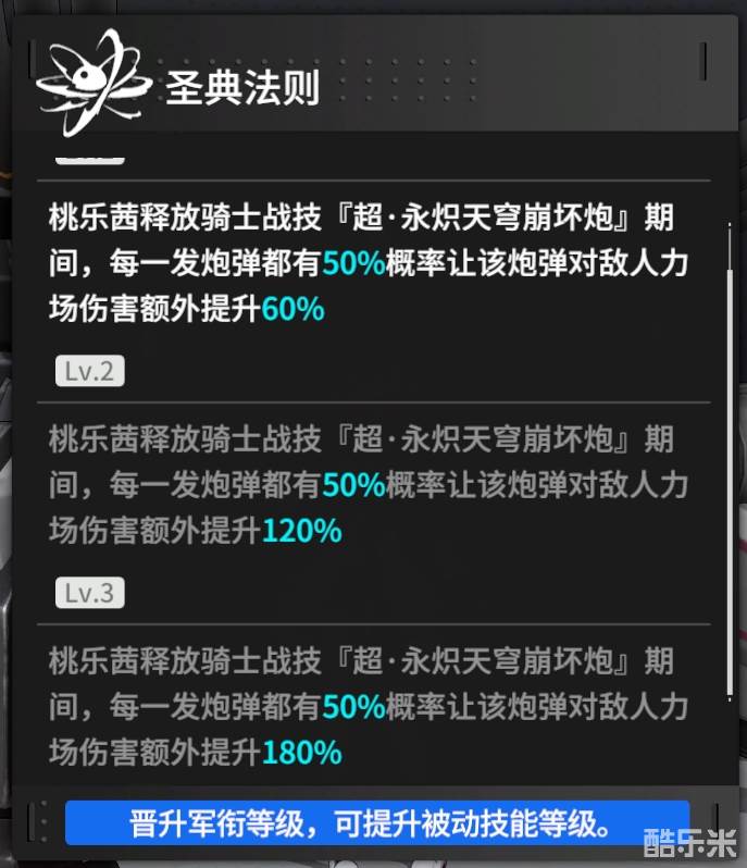 任意暴击都会让对力场伤害提高100%,本来暴击后就是150%的额外伤害,在加上100%的破盾提升,使得每次暴击实际可以达到150%的对力场伤害,本身配合暴击导致的伤害提升,实际破盾会达到一个非常夸张的数值,再配合满级【觉醒式:奇想法阵】的80%提升、满级【圣典法则】的180%提升,使得骑士战技【超·永炽天穹崩坏炮】的上限变得十分夸张,同样该天赋依赖暴击率,因此在装备选择上尽量多一些暴击率属性。