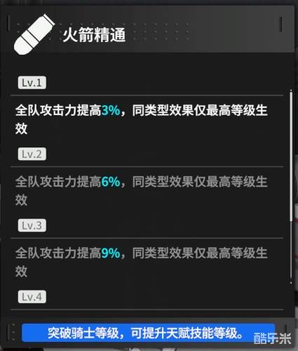 常规的武器精通效果,标准天赋,桃乐茜属于火箭类,因此也是比较受欢迎的全队攻击强化,1级提供3%,满级提供15%。