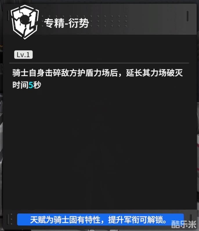 桃乐茜击碎目标力场后,会为后备骑士回复200骑士战技,偏辅助方向的一个天赋效果,对于需要多次击碎力场的BOSS战,有比较高的价值,可以让火力角色爆发更快,节奏更好。