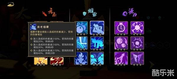 3.混子流顾名思义没有什么输出,推荐在组队并且对内有输出手玩,混子流金爵要求点满3级衰老烟雾,其余的可以优先选择源力球数量