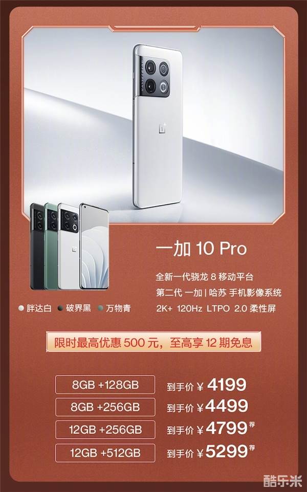 性能、游戏、充电、屏幕等全面拉满的第十代性能旗舰一加 10 Pro,搭载骁龙8旗舰芯,第二代一加 | 哈苏 手机影像系统,2K+120Hz LTPO 2.0 柔性屏,全系产品劲爆直降,限时最高优惠500元,更可享长达12个月的免息优惠,到手价4199元起。