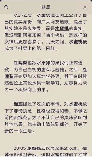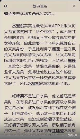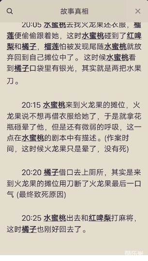 水蜜桃其实是最近抖果APP上很火的火龙果搞笑网红"恰个桃桃".成为网红是她的梦想,但她又不甘心放弃现实中的女神形象,因此需要一个马甲来掩饰自己的真实身份,于是她利用了榴莲一直在欺负火龙果的事情去找火龙果,让火龙果每晚都借衣服给自己拍视频,不然就让榴莲一直欺负火龙果,情侣也是假的,只是想监督火龙果,免得让他说出去这个秘密,但火龙果在出事这一晚突然说不愿意再借衣服了,所以水蜜桃就拿花瓶砸了他。红啤梨不是进口水果,他之前还是苹果时,在有很多进口水果的豪高级水果摊装进口水果,被发现后来到了现在这个摊子,因为虚荣心,他仍然一直把自己包装成进口水果,但没想到被橘子发觉破绽,正好橘子想要杀死火龙果,所以橘子就利用这一点,先让火龙果拆穿红啤梨不是进口水果,再在摊里散播红啤梨不是进口水果这件事并嫁祸给火龙果,让红啤梨对火龙果起杀意。在出事当天,红啤梨用鱼线勒了火龙果。