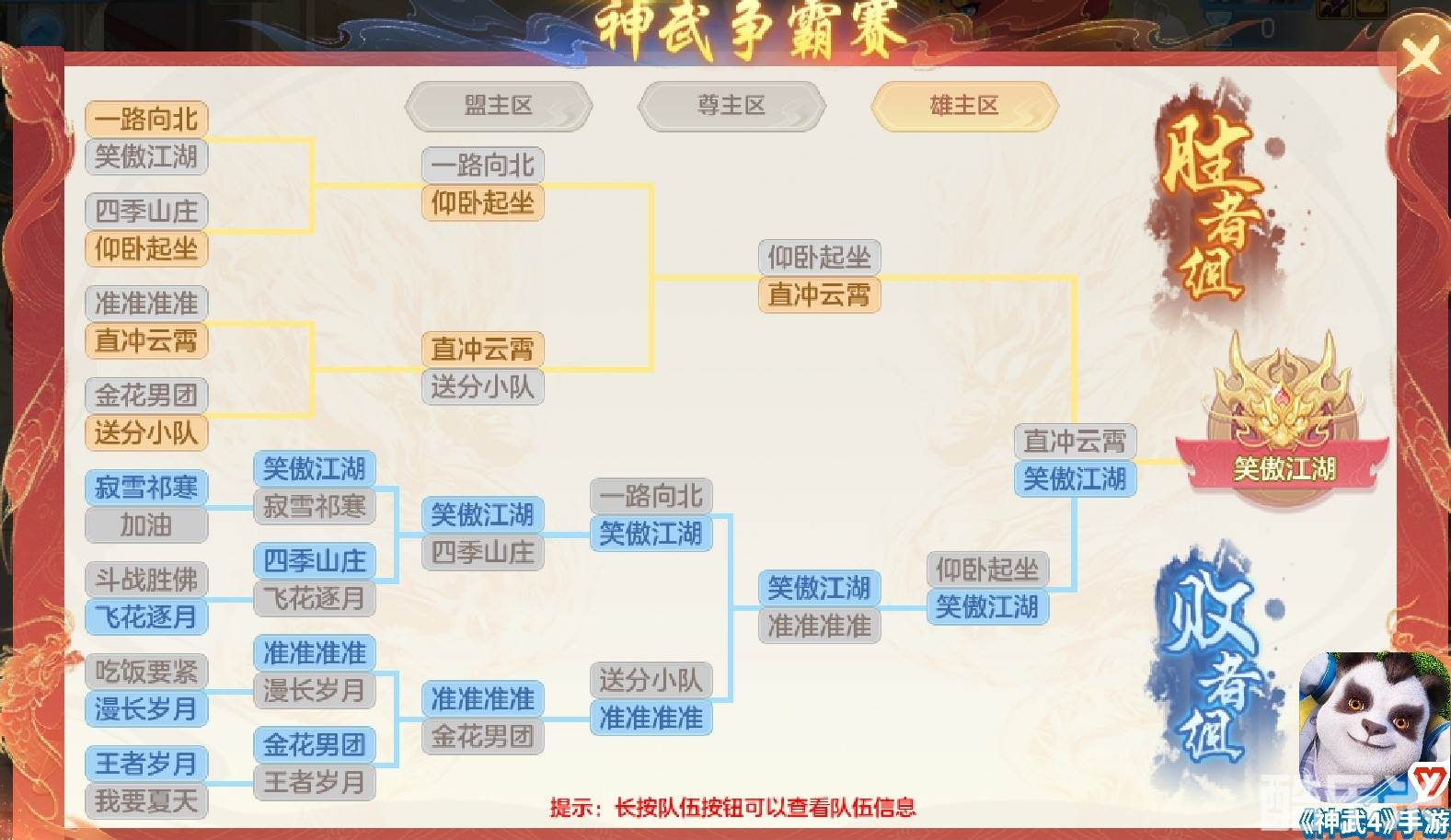随着比赛进展,笑傲江湖战队调整战略开始执行封杀,在第34回合集火封杀敌方龙宫;随后又在第35回合、集火封杀了敌方尾速龙宫,使直冲云霄战队疲于恢复无法阻止有效反击。第44回合,直冲云霄战队佛门成功使用【涅槃重生】复活倒地的3C输出(万兽、双龙宫),但三输出因缺乏宠物支援保护马上就倒在了笑傲江湖战队万兽与龙宫、宠物的群秒配合之下,最终笑傲江湖战队历时第45回赢下神武争霸赛雄主区决赛,成为雄主区冠军!