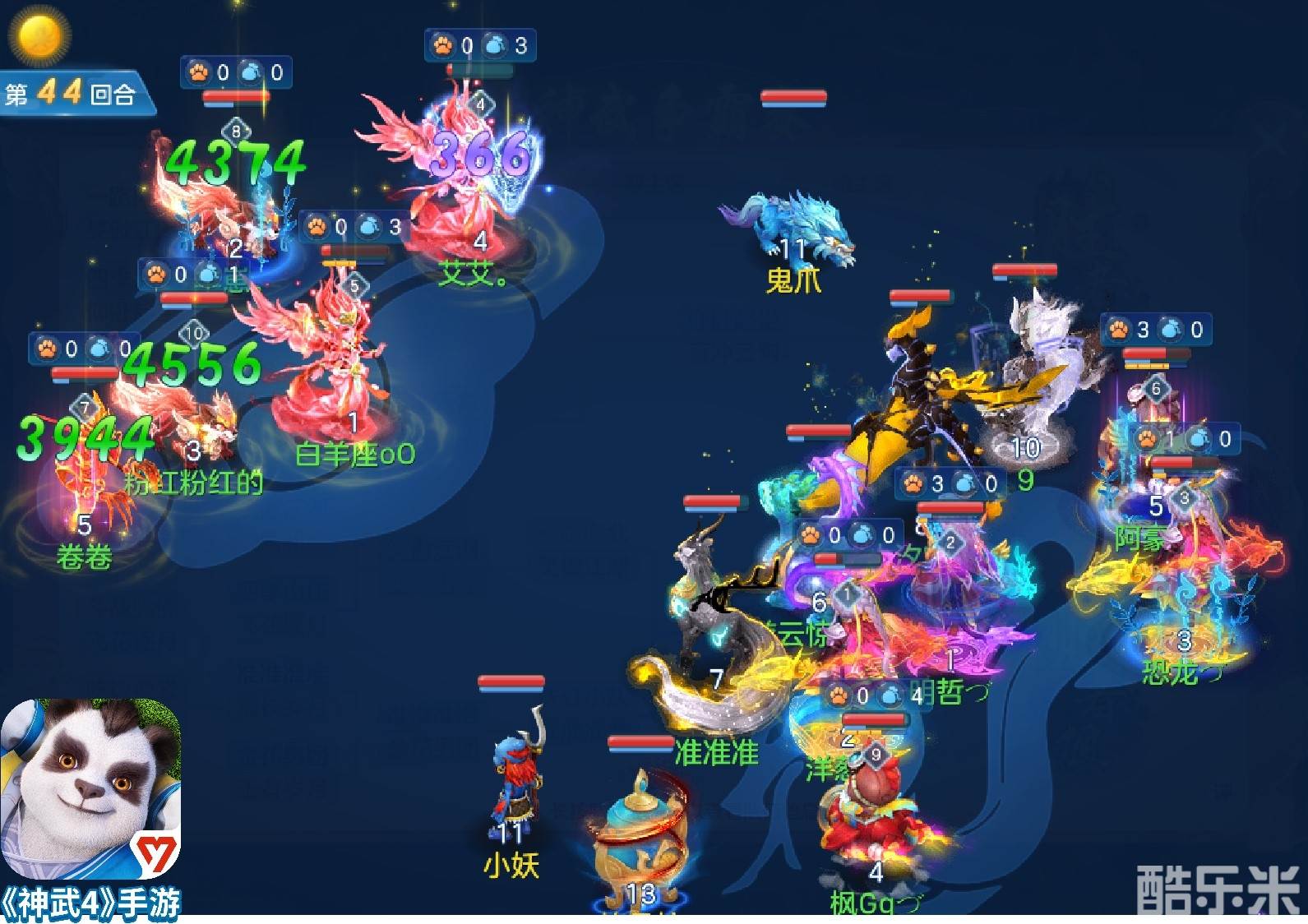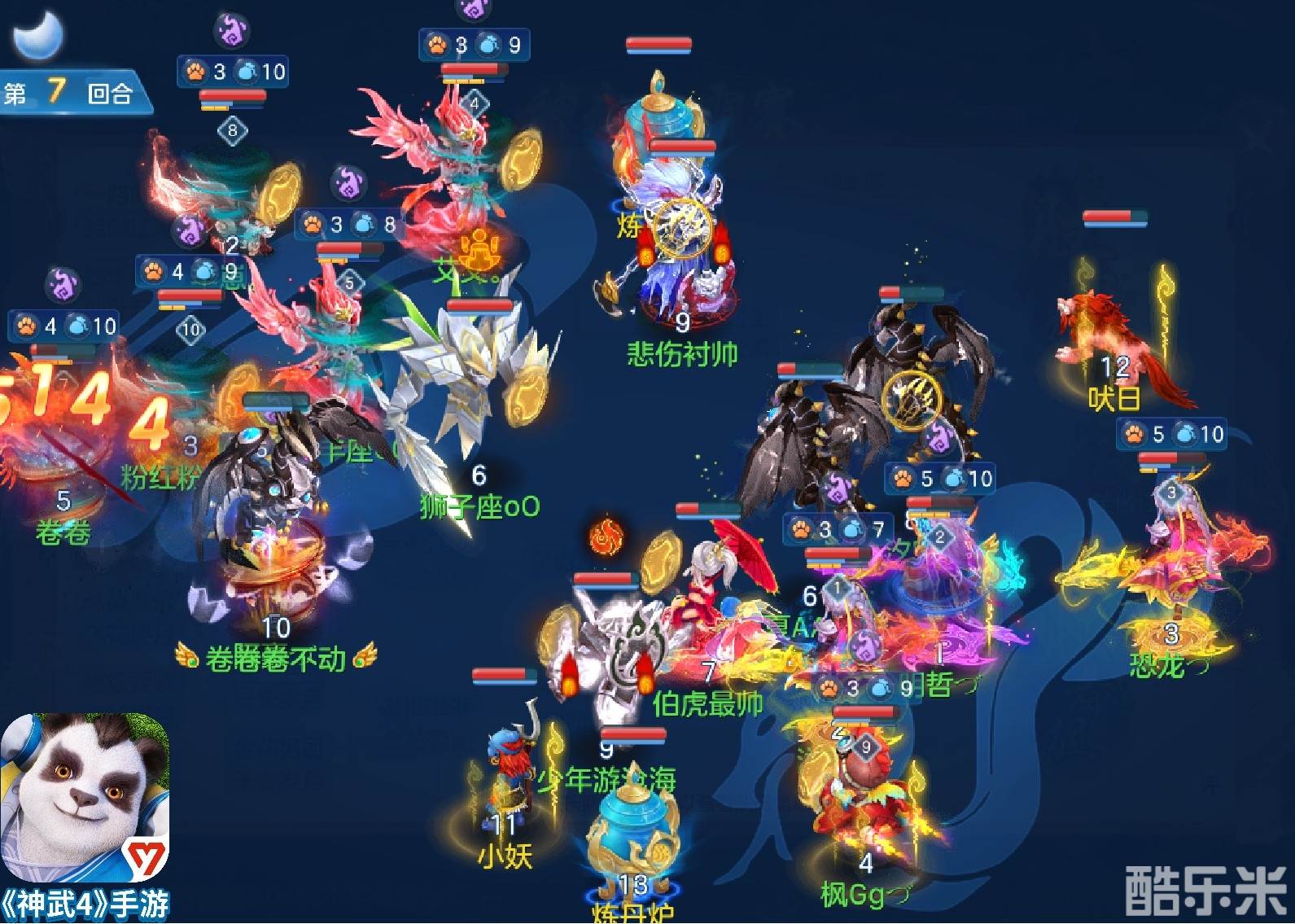 第2回合,笑傲江湖战队丹山释放【山川草木丹】为宠物施加减伤增益,使己方宠物在后续双方万兽的首轮飞击换血中占据优势,并配合魔王的群秒将敌方场上宠物击飞至仅剩1只。第5回合,笑傲江湖战队曜华释放【残阳】为己方选择时光机变身卡的万兽提供夜间攻击增益,丹山则释放【忘川鬼风】驱散敌方宠物获得的减伤增益及敌方万兽的伤害增益,万兽【飞击】对敌宠物飞出了3500+的高额伤害。第7回合,笑傲江湖战队万兽【飞击】触发狂暴状态,对敌宠物造成3000伤害,更是暴击敌方万兽打出了本场对局单目标最高伤害5144!