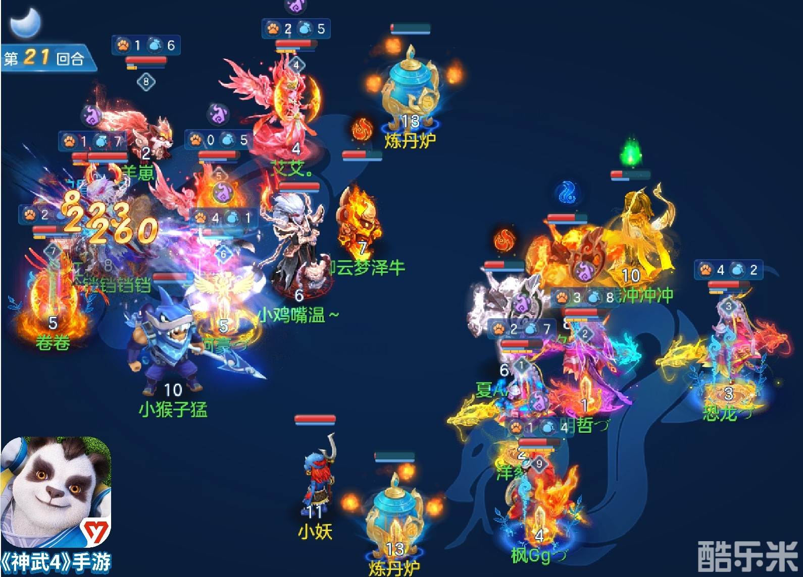 第21回合,笑傲江湖战队曜华释放【残阳】为万兽提供“夜战”状态加持,直冲云霄战队尾速龙宫则再使用提速技能【龙翔九天】击倒“笑傲江湖”队万兽,意图再次阻断笑傲江湖战队的进攻节奏。但笑傲江湖战队的佛门预判了敌方龙宫的高速狙击,微操使用尾速复活技能【摩诃无量】拉起倒地万兽,拥有(激励、伽蓝战气、明王镇狱、虎魄)等多重伤害增益状态的万兽再次暴风出击,造成高额群攻伤害。至21回合结束,笑傲江湖战队剩余宠物资源占据较大优势,对手直冲云霄战队则剩余更多的药酒资源。