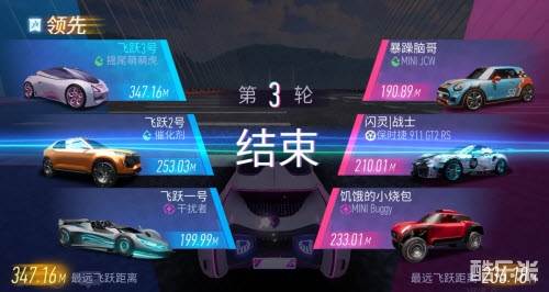 6、在“飞跃天际”玩法中,每场比赛分为三个回合,每回合车手们都可以重新进行车辆选择。进入玩法后,车手们将通过一小段直线助跑赛道,之后从跳台上飞跃而下,三回合内,取得最远飞跃成绩车手所在的小队将获得比赛的最终胜利!一时的失利并不能决定最终的胜负,打起精神,拼尽全力超越自己吧~