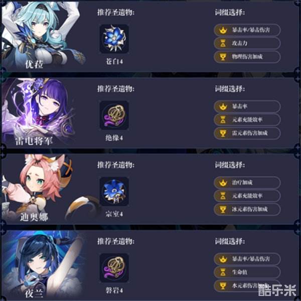 3、点评:该配队最大的难点在于如何解决夜兰和云瑾的充能问题——上述循环下O命夜兰大致需要180%的充能来保证循环,而云瑾依赖高精西风枪的同时对自身的暴击率也有一定要求(50%以上),如果你的充能缺口很大,可以考虑选用充能沙漏来保证循环。
