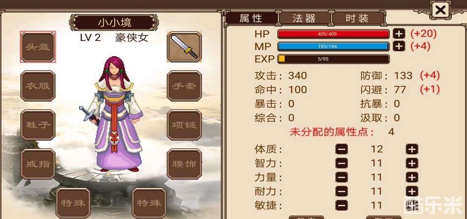 第二个法宝:属性点,每次升级后都会产生五点自由属性点,记得及时分配哦!