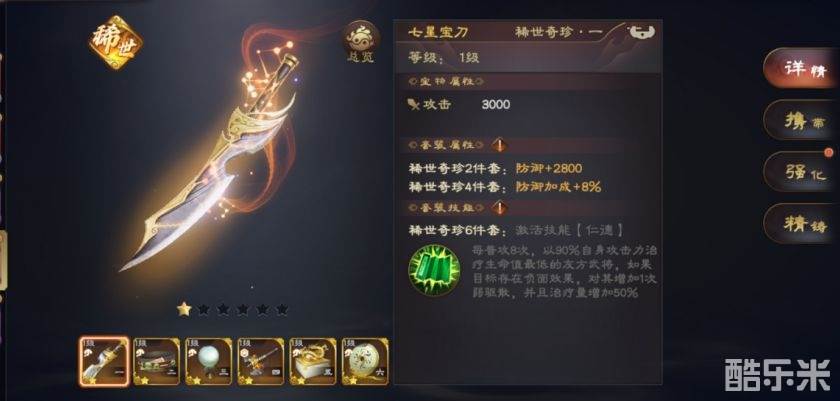 凑齐六件宝物后,激发“仁德”技能,每一次普攻都可以给生命值最低的友方武将回血,如果目标存在负面效果,还可以进行驱散