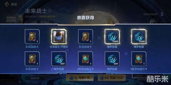 2、充能奖励:充能1次消耗“能量核心”×6(充能10次消耗60),每次充能随机获得1份奖励(充能10次获得10份),包含皮肤、表情、边框、魄罗能量等丰富内容;