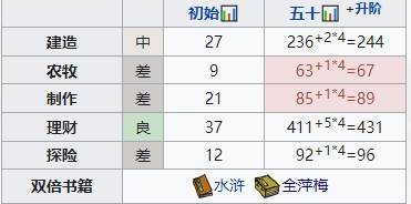 满级属性:建造244,农牧67,制作89,理财431,探险96。