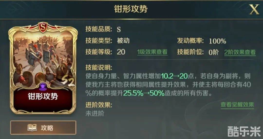 【钳形攻势】在游戏中是一个增加自身属性、并为主将施加增益的被动技能,尤其每回合有40%概率为主将提高50%伤害,能够让主将伤害大幅度增加,极大程度上加强了战斗能力。具体效果如下: