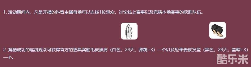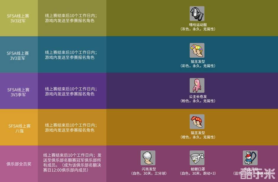 其余奖励也十分诱人,冠军可以获得灰嘻哈套装,亚军可以获得猫王发型,季军可以获得公主长卷发,八强可以获得橙色猫王发型,还有俱乐部全员奖。