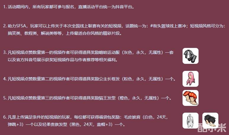 助力SFSA,报名的玩家可在抖音平台直播本次全国联赛的所有赛事,开播自定话题统一为:#街头篮球线上赛冲。