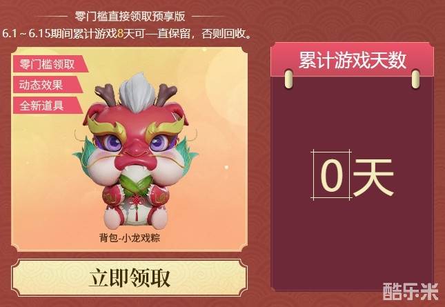 除了以上可以直接在游戏内活动中心领取的福利之外,安琪儿还为各位NZer准备了全新的动态效果背包—小龙戏粽。只要在6月1日~6月15日期间,累计游戏8天,即可—直保留。