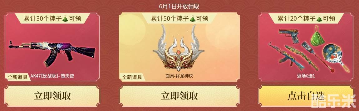 在6月1日-6月15日的活动期间,完成每日任务与每周任务,还可以领取粽子奖励,通过消耗粽子,可以兑换AK47【逆战版】-堕天使、面具-祥龙神纹、以及经典武器道具返场6选1。