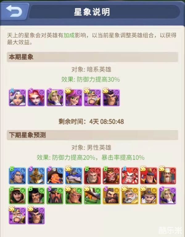 星象每周刷新一期,对指定英雄有加成影响,5名全部享受星象加成的英雄,对上5名没有加成的英雄,即便原本战力不如,也将拥有一战之力!