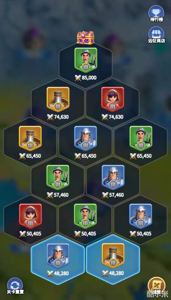 每座城池的每一层关卡,可选守军的士兵阵容都不相同,领主们可尽量挑选自身军团主力兵种克制的敌人。由于每层存在多个选择,因此还涉及到进攻路线问题,倘若不小心选错导致难以通关,可以点击左下角关卡重置按钮,重新选择进攻路线。