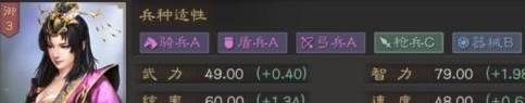 兵种适性为:骑兵A、盾兵A、弓兵A、枪兵C、器械B