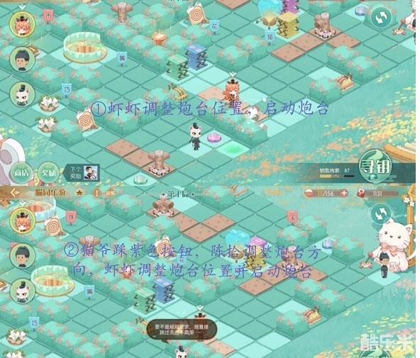 2、猫爷踩紫色按钮,陈拾调整炮台方向,虾虾调整炮台位置并启动炮台。