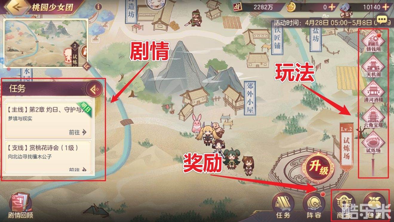 ③ 试炼场奖励分为每日奖励与排名奖励,奖励可获得阶段性材料、桃园币和元宝;