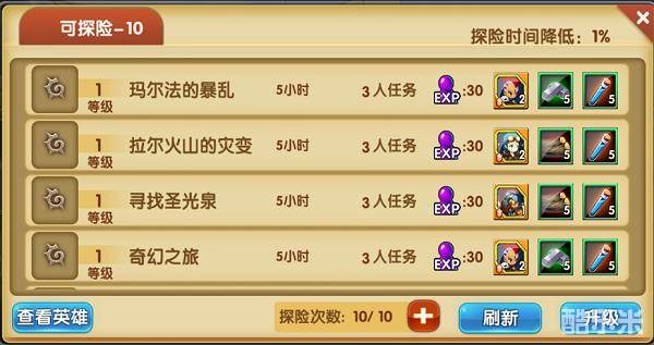 玩家可派遣英雄参与探险,完成后可以获得奖励。挂机参与,派遣英雄后,玩家只需等待英雄完成即可。每天可以参与10次随从探险,次数消耗后,可以使用钻石购买参与次数。如果玩家对当前探险的奖励不满意,可通过点击刷新按钮,消耗钻石刷新奖励。