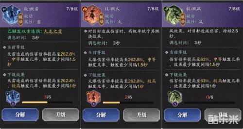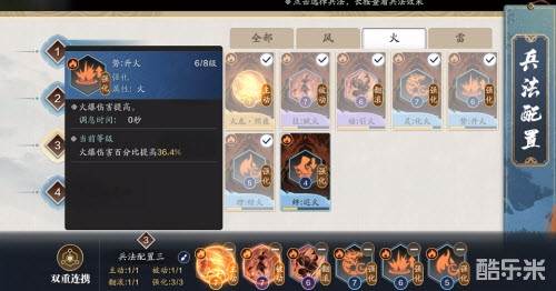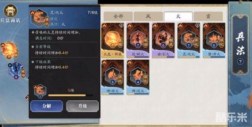 6、兵法优先级:雷更多感觉是前期兵法,后期其高AOE伤害特性被被带有【升风】增益的风追上,而释放时间又不如有【蓄风】加持的风主动,连引以为傲的雷盾+回血还被风雷的麻痹所替代。所以后期推荐优先火,其次风,最后雷。