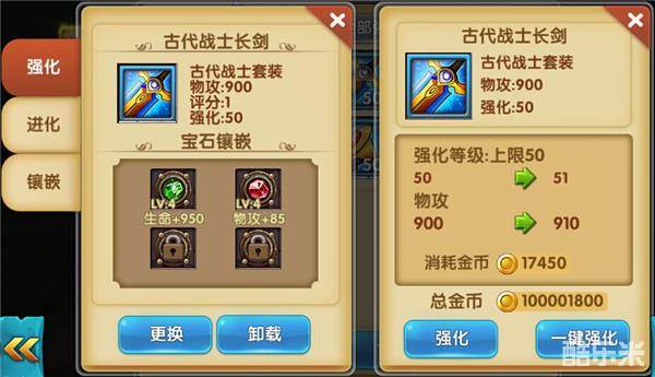 装备通过强化可以获得更强大的属性,强化需要消耗金币,金币可以在关卡和任务中获得,强化是提升装备属性以及玩家战斗力较为直接的方法。