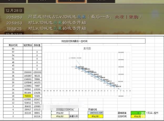 故事开头得从2222一赛季准备抢江夏关卡说起,当时山东背刺准备开夏口(夏口处于无人占领状态),我方探子打探到对面开城时间,立即部署夏口准备抢龙,当时盟主丸子大佬豪气万丈,下令抢到大龙(最后一击)128奖励。当时我做了一个简单的EXCEL表,记录每2分钟城皮剩余值,据此计算出最后城皮数值到0时间,派出器械,碰巧被我拿到了最后一击。如今官渡之战,又遇到需要和友盟抢乌巢的境况,也心血来潮,重理思路,重新完善了EXCEL的预测表,以此增加抢龙把握。