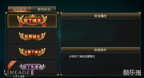 占领亚丁、狄恩和古鲁丁三个城池其中之一的血盟盟主可以获得无上的荣誉——城主称号。
