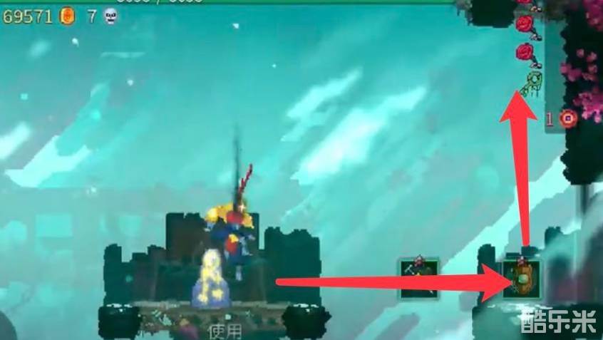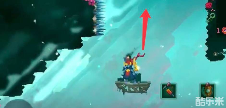 2、打开大门后,挑到大门上方的位置,然后挑到箭头的石头上。