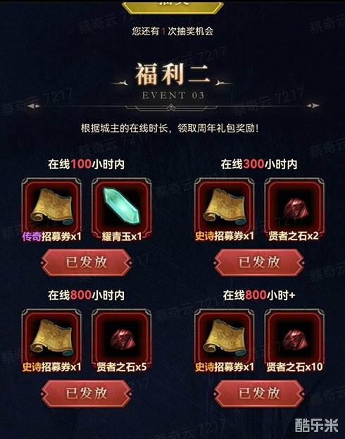 最后大家可以用自己的冒险时间和征程兑换不同档位的游戏奖励,幸运的城主还可以抽得一份官方定制的周年纪念周边。