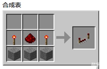 在工作台中,1个红石粉、2个红石火把加3个石头按上图铺开可以获得1个红石中继器