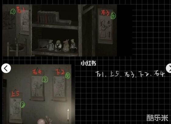 左下箭头,床下抽屉老钥匙打开得到【人形小木人】放到右侧箭头房门右侧墙上图案中央,根据壁画手臂所指方向和数字,按照年龄顺序从小到大排列如图为“左1上5右3下2右4”移动小木人,出门通过剧情(感觉司机是个木偶)