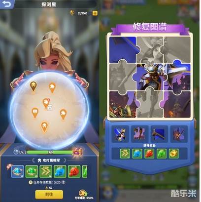 探测分消除魔物、修复图谱、救援士兵、攻打黑暗军、黑暗军首领5种玩法,可从中获取大量资源、魔法精粹、加速道具等任务奖励。
