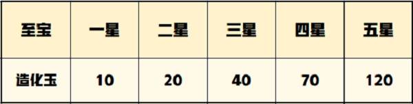 1、至宝最高可升至五星,每次升星所消耗的造化玉也是不同的,具体的升星消耗如下图所示: