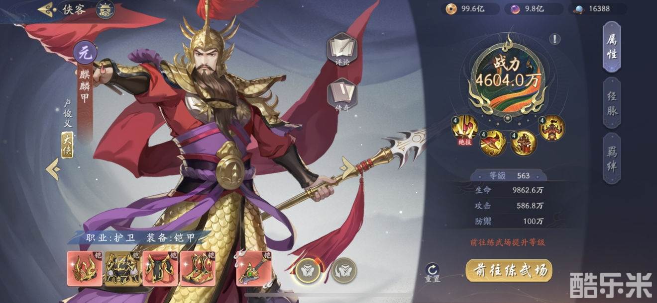 红一卢俊义,没有给经脉和秘籍,普通红色装备,练武场等级必须给。