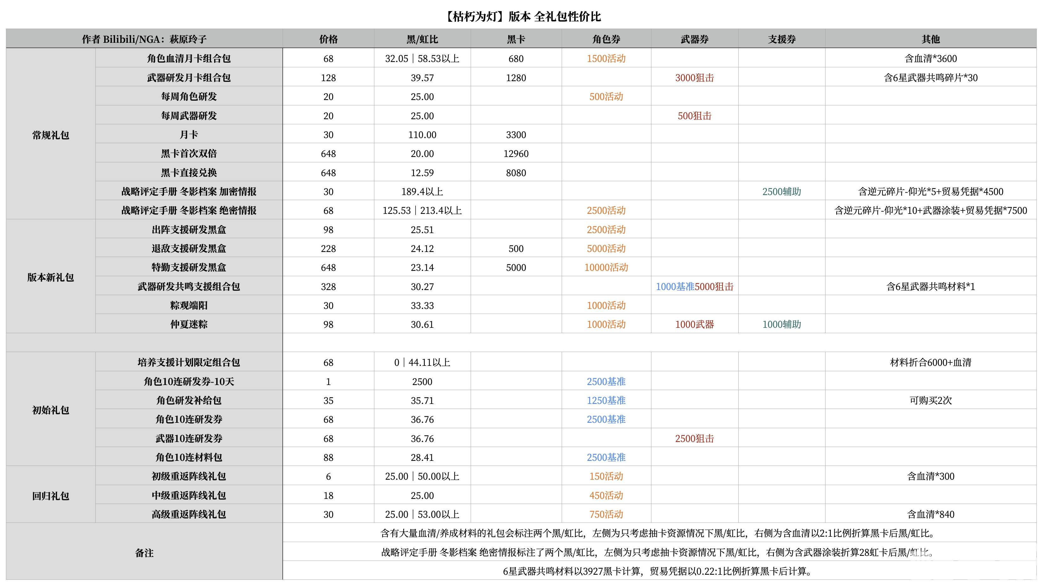 黑/虹比为礼包每1虹卡等价的黑卡量,可视为礼包性价比的量化指标。建议结合个人实际需求,从黑/虹比高的礼包开始购买。
