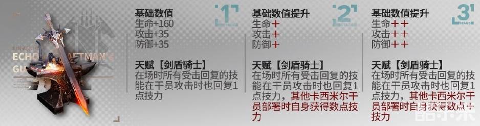 在场时所有受击回复的技能在干员攻击时也回复1点技力,其他卡西米尔干员部署时自身获得数点技力