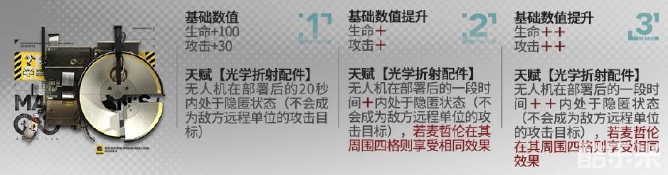 麦哲伦的模组还是比较推荐升级的,不过至于要不要升三就看个人情况了,如果麦哲伦部署在无人机周围四格则也可以享受隐匿状态的效果,这条附加效果有用但作用有限,限制了无人机的拜访位置,毕竟到这种情况会更加希望能将无人机摆放在角色周围,以让本体吃上加成,如果不吃角色隐匿的加成的话,另外还有无人机的隐匿状态延长的效果,也还算不错。