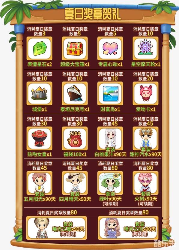 累计消费10000金币后,每额外消费1000金币,即可获得一份“夏日奖章”,使用“夏日奖章”兑换特别奖励: