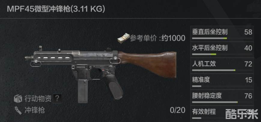 MPF45是一把使用.45口径子弹的入门级冲锋枪,后坐控制、精准度都比较低,不过76的腰射稳定度和700的射速还算不错。