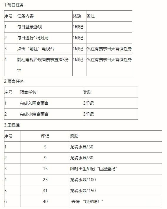 1. 入围赛共16支队伍参与,分为4组,每组可预言2支队伍晋级小组赛,一共可选择8支队伍进行预言。每预言正确1支队伍得龙魂水晶*50,上限400;参与预言还可得印记*3。