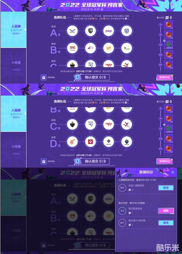 1. 小组赛预言将在入围赛预言奖励结算后开启,于6.21 17:00截止。