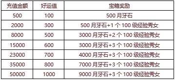 【活动内容】活动期间可通过充值金币获得好运值,积累好运值即可打开宝箱奖励,众多经验秀女,大量月牙石,绝对超值的提升战力资源,尽在特惠好礼。