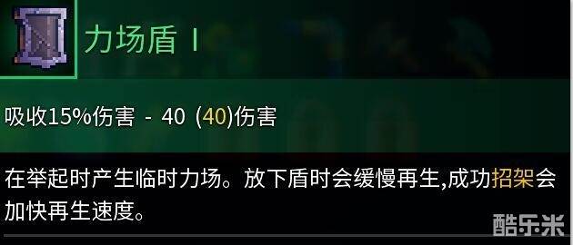 举起盾时产生临时的力场,放下盾时缓慢再生,成功招架会加快再生速度。弹药突变对这个装备不起作用。