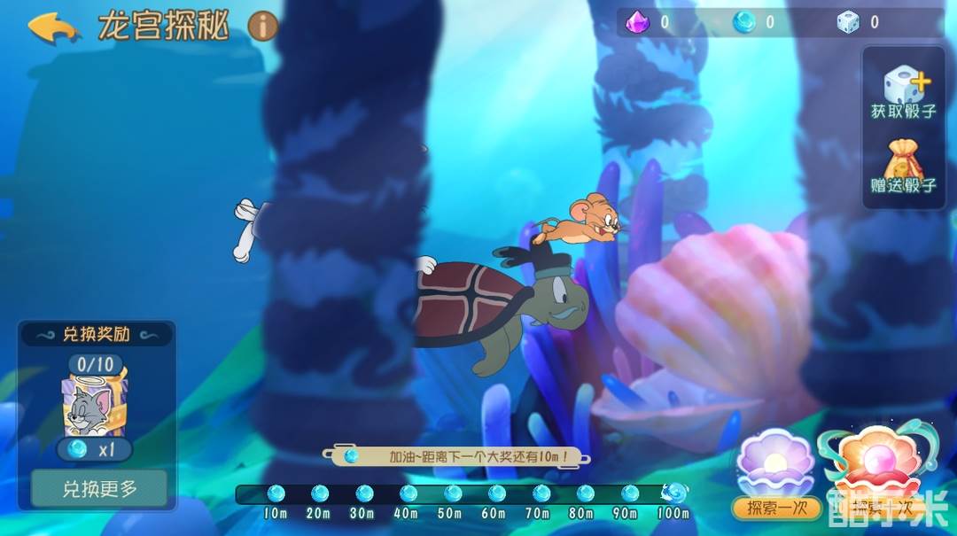 6月9日至7月10日,小伙伴们完成相关任务,即可获得投骰子次数,对龙宫进行正式探秘。每探索一次需要消耗一枚骰子,并随机前进1-6米的探索进程。探索中小伙伴们会获得紫水玉奖励,并根据前进的距离,每10米获得1个碧蓝宝珠,到达100米终点时更能直接获得1个碧蓝宝珠、250紫水玉和1个龙宫明珠的奖励!