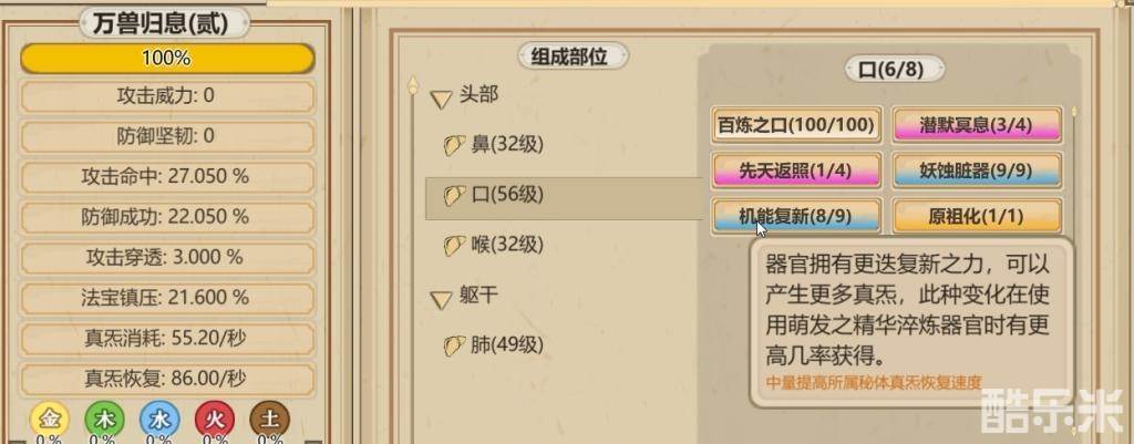 [机能复新]要用萌发之精华淬炼才出,这个只能在春天通过吐纳来获取。想要提高吐纳效率的话,就得强化鼻、喉、肺三个器官的基础百炼,而且这三个器官还能提高真炁恢复,又是万兽归息秘体的组成部分,所以练完口胃肠就来炼它。