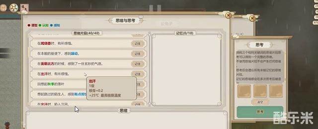 使用三个关键词相同的思绪片段“思考”才能得到一个完整的思绪,你需要有选择地记住这些思绪,才能开启灵智。当你“思考”出一个完整思绪后,之前未被记忆的思绪片段都会被情况。