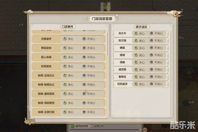 门派消息弹窗将可以自定义管理,既可以管理各类门派事件是否弹窗提醒,也可以对门派内某个小人的消息选择关心或不关心。